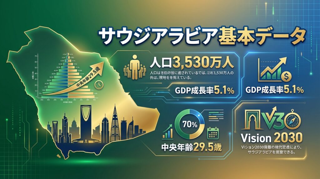 サウジアラビア不動産投資を検討する前に知っておきたい基本データを完全網羅。人口3,530万人、中央年齢29.5歳の若い国、GDP成長率5.1%予測、Vision 2030の進捗状況など、投資判断に必要な最新統計を詳しく解説します。